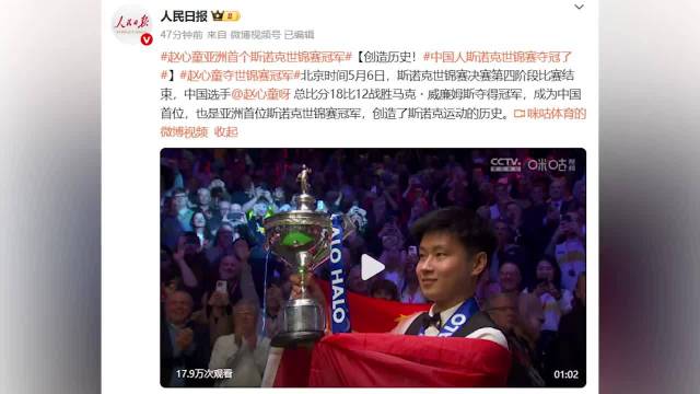 赵心童录视频感谢球迷 丁俊晖发文祝贺:为中国力量崛起感到骄傲!